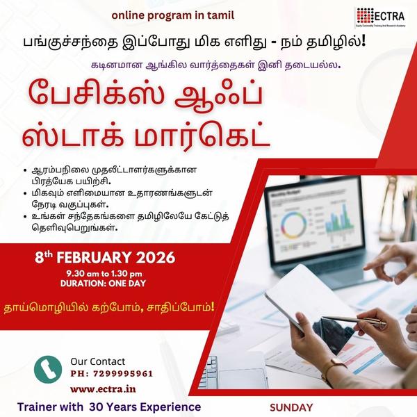 A great place to learn from foundation level. I attended the "Master The Stock Market" MSM course. Instructor, Mr Arulrajhan Sir, patiently answers to all questions in the most succinct and clear way in both Tamil and English. He makes it a point that everyone in the course is following by giving live mini assignments to practice on easily available tools online. And also corrects us immediately