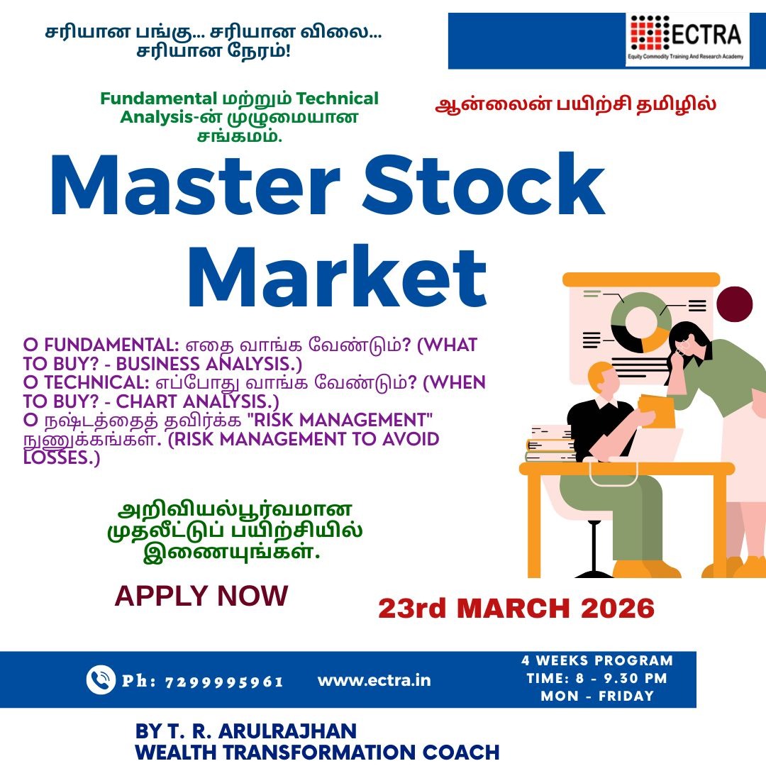 Master Stock market Online Training Program: Stock exchange follow the real-time margin system to ensure the smooth settlement of all trades. In order to follow this system, exchange will always keep the buffer amount collected from the trading members. Understand the stock market features and learn more. Online training program by ECTRA T. R. Arulrajhan. Limited seats are available. Book your seat right now through online.