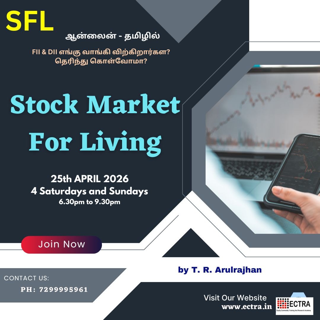 Stock market For Living - SFL Learn the concept and strategy and practice it in live market sessions to earn a second income. Want to go a step higher with Mentor ECTRA T. R. Arulrajhan in intraday and investment? Make use of this opportunity. Online training program by ECTRA T. R. Arulrajhan. Limited seats are available. Book your seat right now through online.