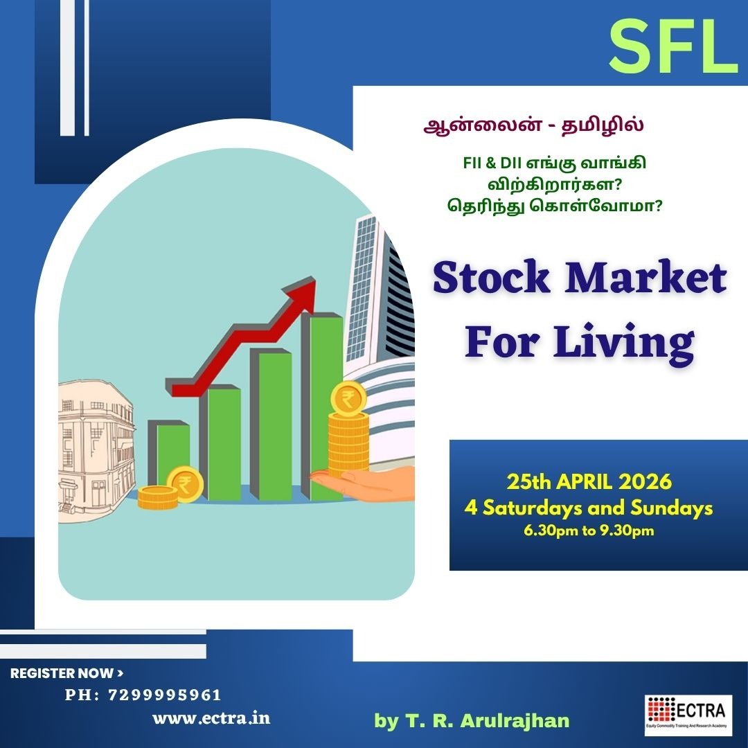 Stock market For Living - SFL Stock market For Living is an one month course for the serious trader to plan to earn money consistently in the market. The course will guide the participant to the step by step approach to achieve the goal. Online training program by ECTRA T. R. Arulrajhan. Limited seats are available. Book your seat right now through online.
