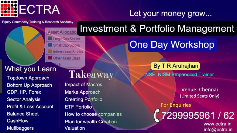 The Course Content is as follows: 1. Investment & Portfolio Creation Choosing the right company Top down & Bottom Up approach Objective Oriented & Risk Oriented Managing & Reviewing Portfolio ETF Portfolio Multi Bagger Analysis 2. Understanding Macro Economic Factors Gross Domestic Produce (GDP) Inflation Interest Rate Exchange Rate Foreign Direct Investments (FDI) Foreign Institutional Investment (FII) Fiscal Deficit Trade Deficit Current Account Deficit 3. Sector Analysis Porter’s Five Force Model 4. Fundamental Analysis Company Financial Statement Analysis Income Statement Balance Sheet Cash Flow Statement Intrinsic Value, Earnings per share (EPS) SWOT Analysis Ratios [Price Earnings Ratio (PE), Price Earning to Growth Ratio (PEG) and other important ratio] 5. Technical & Strategical Analysis Understanding and applying Beta Different Stocks [Growth Stock, Defensive Stock and Cyclical Stocks] Construction & Management of Portfolio Outline of Technical Analysis, Success in Stock Market We have Online Sessions in both English and Tamil language. Check the Upcoming Training Schedule and Book a seat!